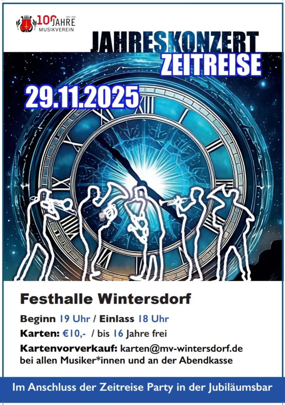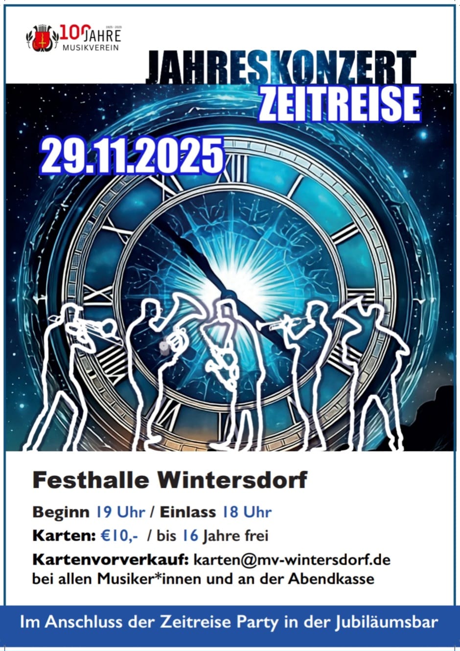 Liebe Wintersdorferinnen , liebe Wintersdorfer, im Rahmen des 100-jährigen Vereinsjubiläums lädt der Musikverein Wintersdorf herzlich zum diesjährigen Jahreskonzert ein!Samstag, 29. November 2025 Festhalle WintersdorfEinlass: 18:00 Uhr, Beginn: 19:00 Uhr Eintritt: 10[…]
