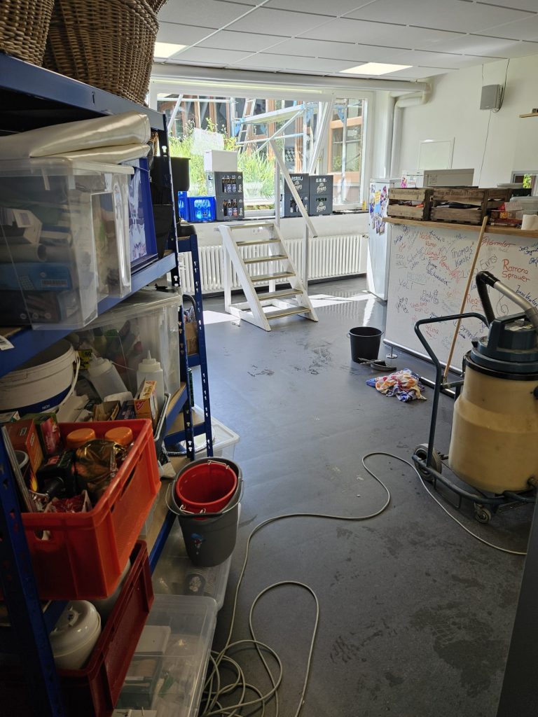 Nach kurzer Begutachtung wurde unsererseits sofort mit Trocknungsmaßnahmen begonnen und die betroffenen Instrumente und anderes Material „in Sicherheit“ gebracht.